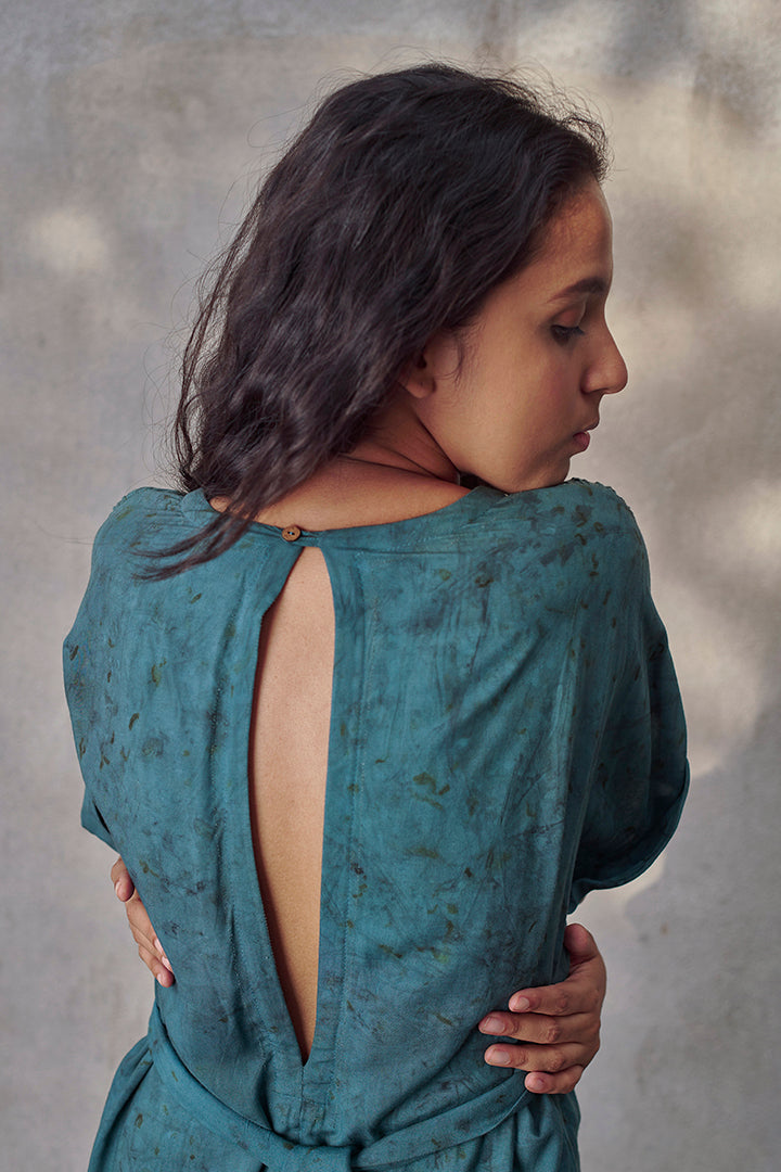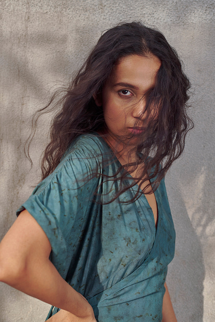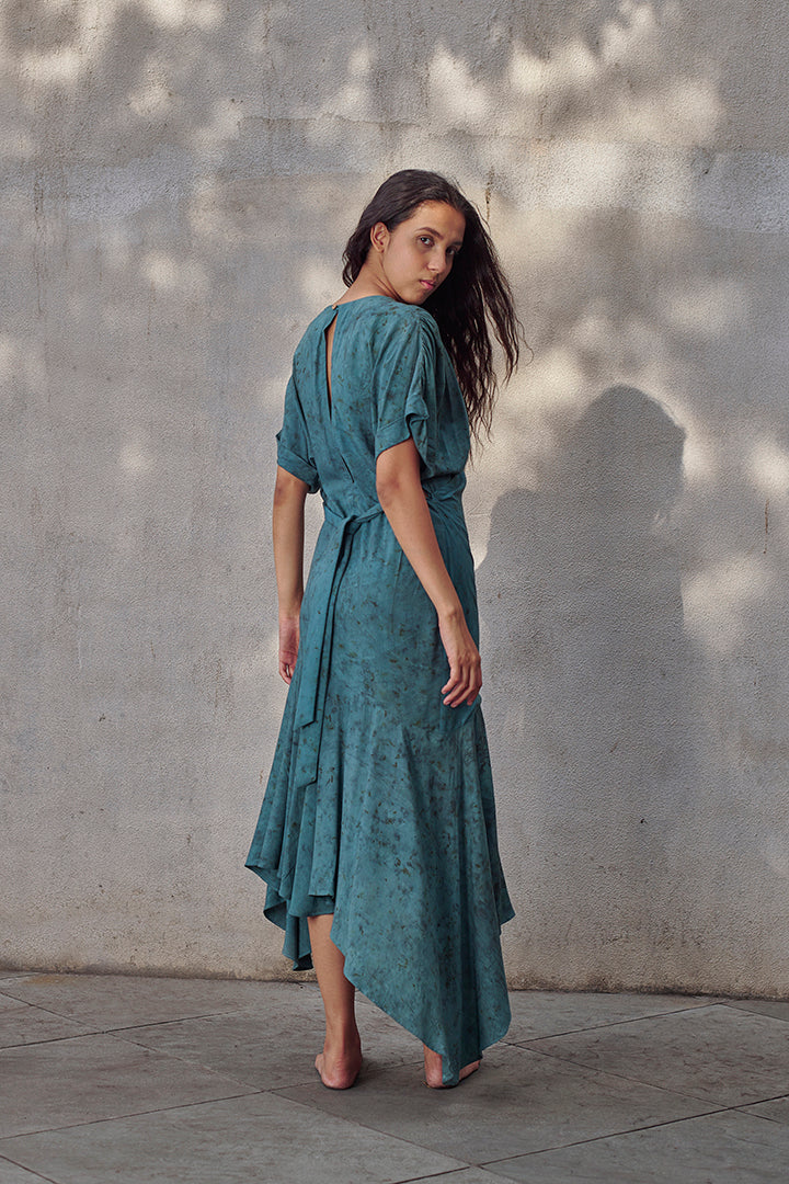 Wrap dress with a twist? Oh yes!. Our Jade dress is made in aloe vera fabric and dyed in indigo and marigold. It features gather details on the sleeve and a bias fall on the bottom, making it suitable for all body types.