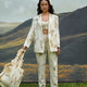 Elevate your wardrobe with this versatile 3-piece blazer set. Made from luxurious handwoven ecoprinted khadi cotton, the blazer features a timeless notch collar with a back slit and an open front for a relaxed yet sophisticated fit. The trousers are simple yet beautiful with its straight cut, eco printed leaves design and flattering pleat details at the waist. The bralette is perfect for a layered look or wear it solo as a playful top.