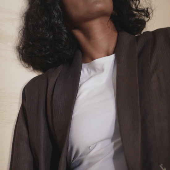 Effortless and chic. This Mahogany set includes an open overlay that's so easy to throw on and pyjama style baggy pants that's comfortable and stylish. The Overlay has a shawl collar and slant pockets in the front with delicate hand embroidery details for functionality and a beautiful highlight. The pants are high-waisted pants have a baggy silhouette, elastic waist, side slit pockets and a folded hem. Perfect for lounging at home or going to new places if you ask us.