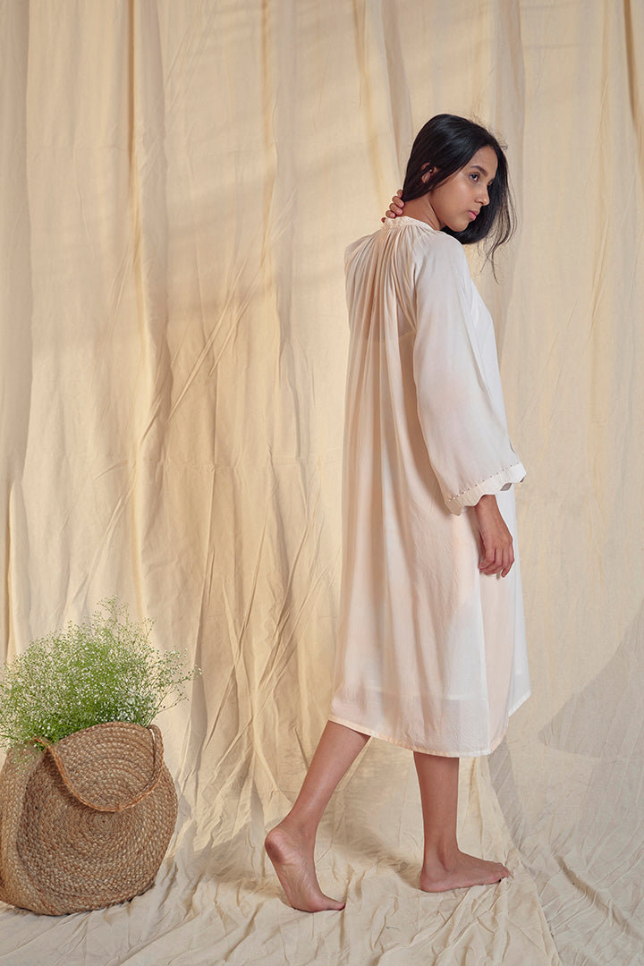 Keep it simple. The Waterfall is a shirt dress with gathers all around the neck and pearl embellishments on the collar and sleeves. It has slightly belled sleeves and beautiful scallop edging at the ends.