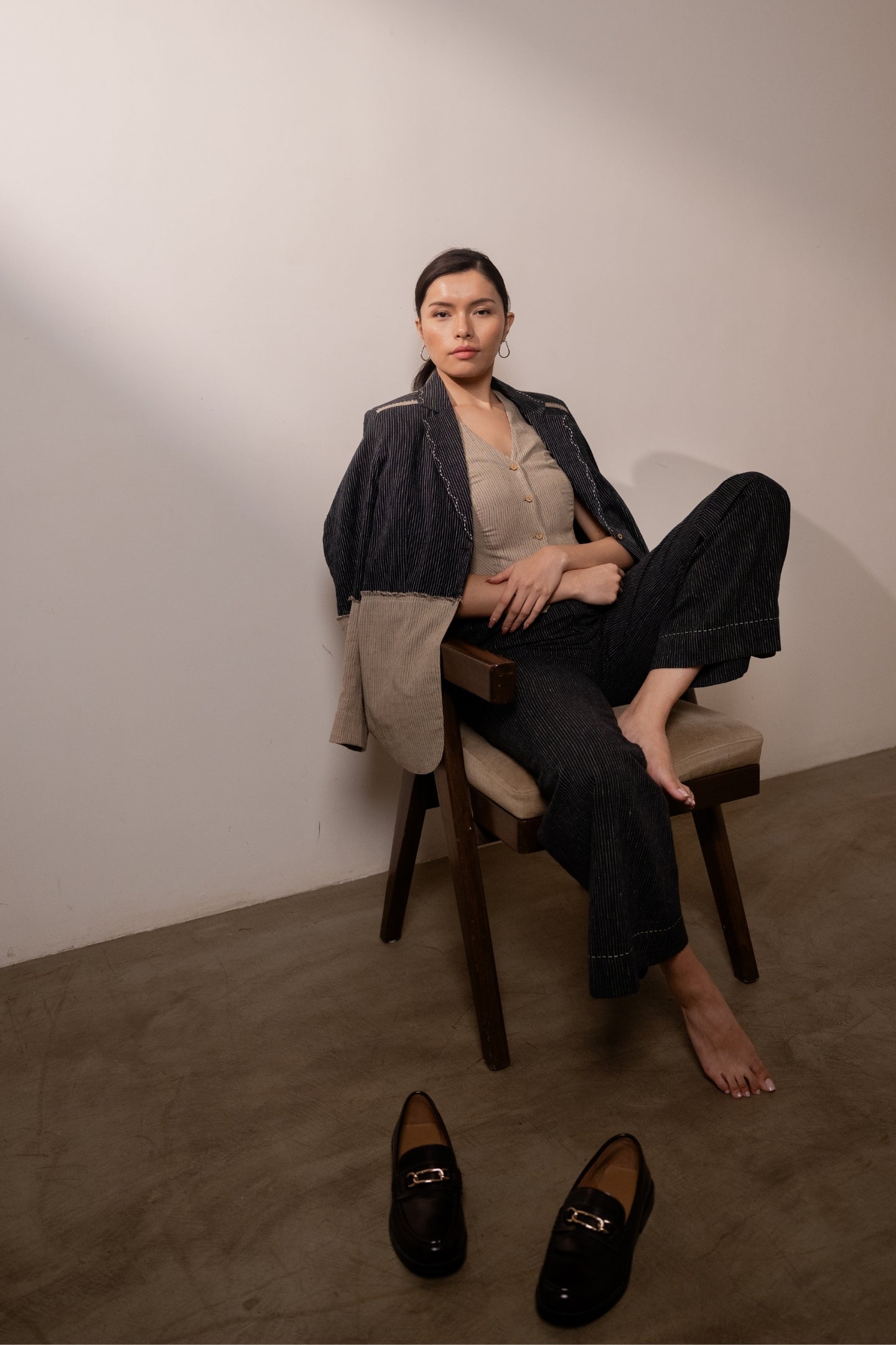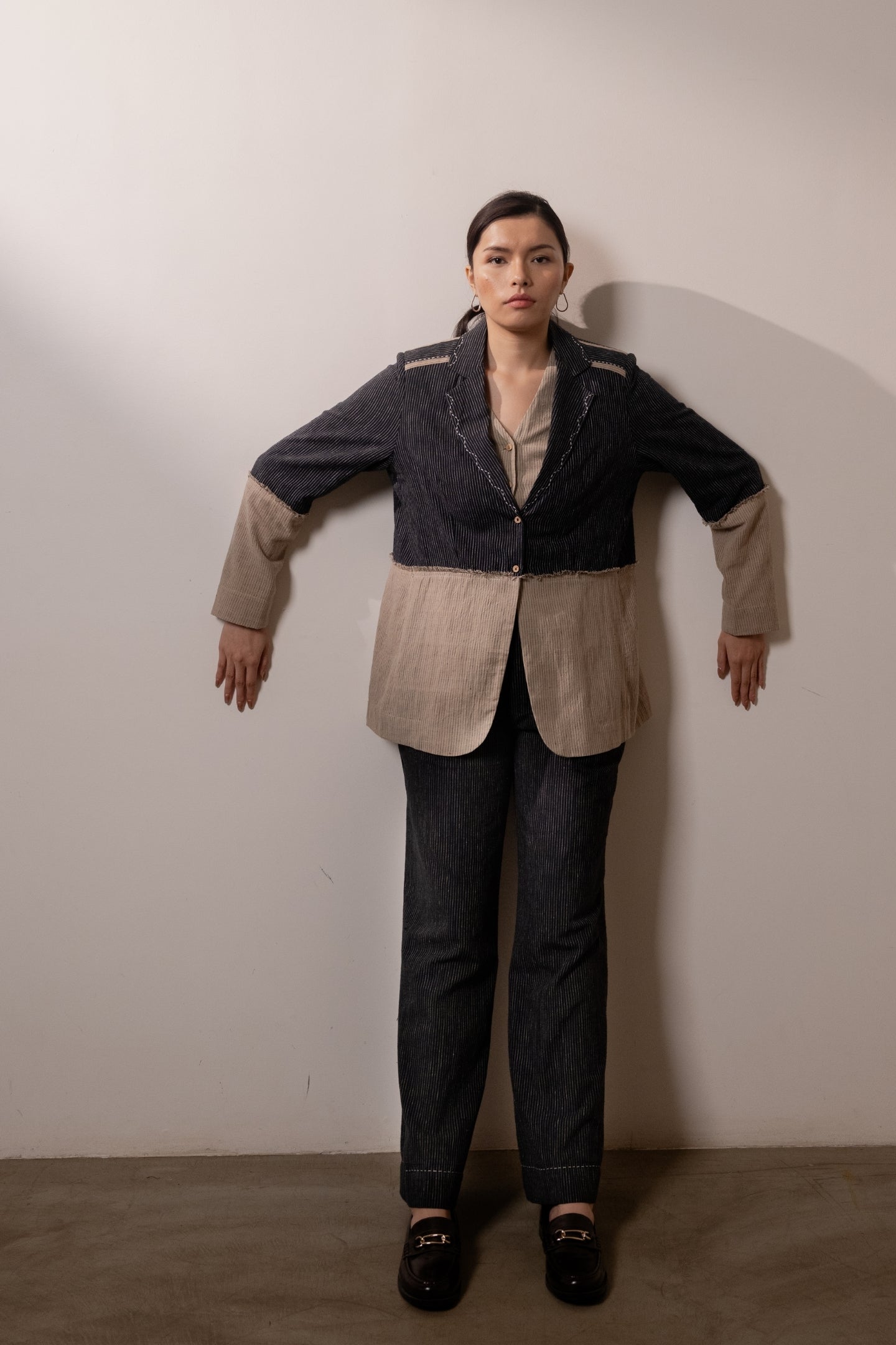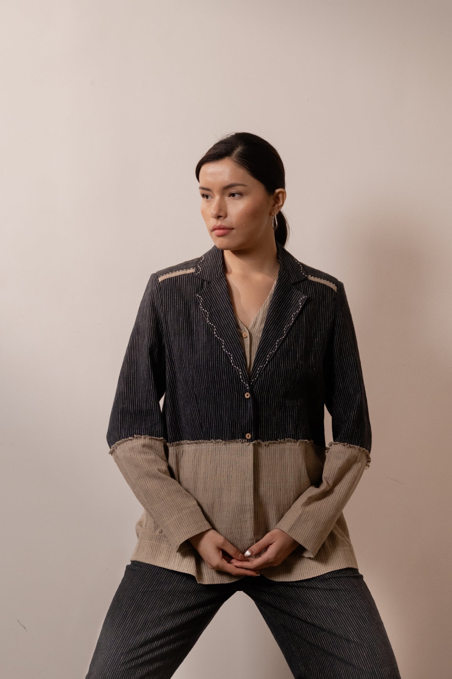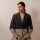 Designed in a comfort fit, this piece features a classic notch lapel detailed with contrast scallop embroidery for subtle texture. Unfinished threads at the seam where fabrics meet serve as a thoughtful design feature, adding quiet, handcrafted character.