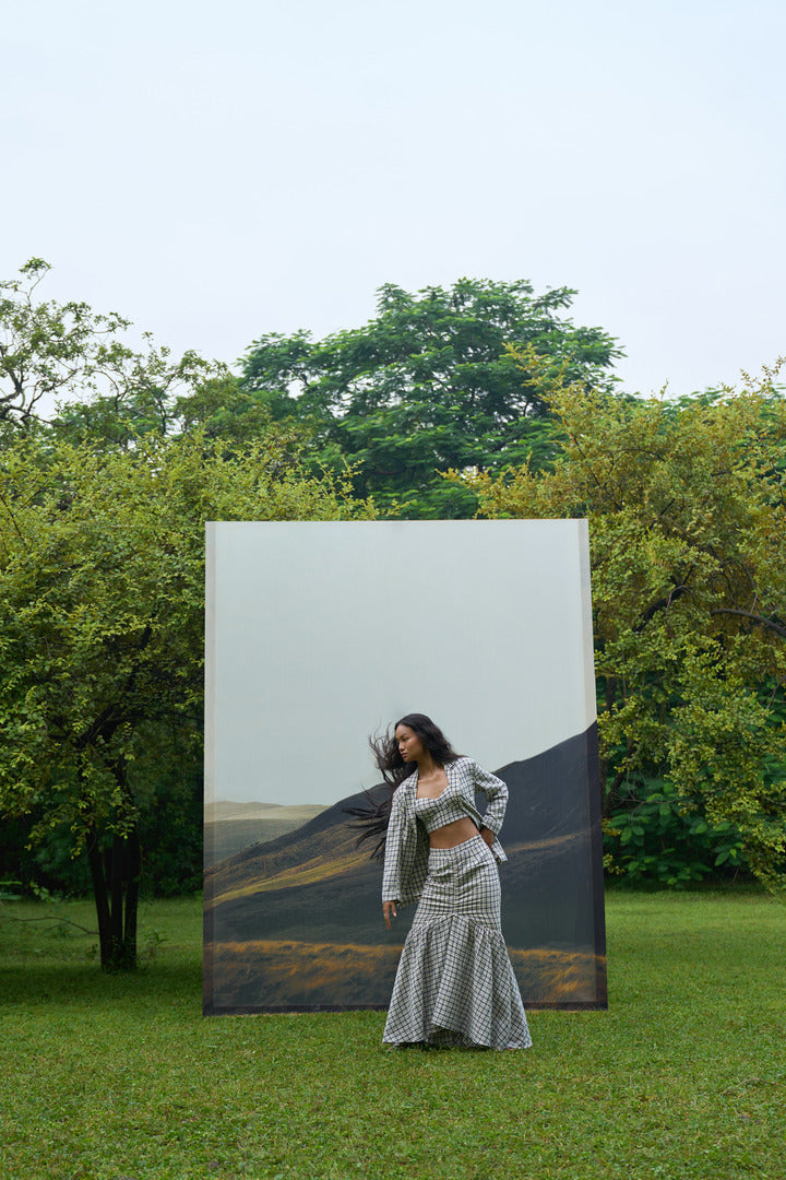 Elevate your wardrobe with this versatile 3-piece blazer set. Made from luxurious handwoven kala cotton, the blazer features a timeless notch collar with a back slit and an open front for a relaxed yet sophisticated fit. The skirt is a statement fish-cut skirt designed to accentuate your curves and create a bold, feminine silhouette. The bralette is perfect for layering or wear it solo as a playful top.