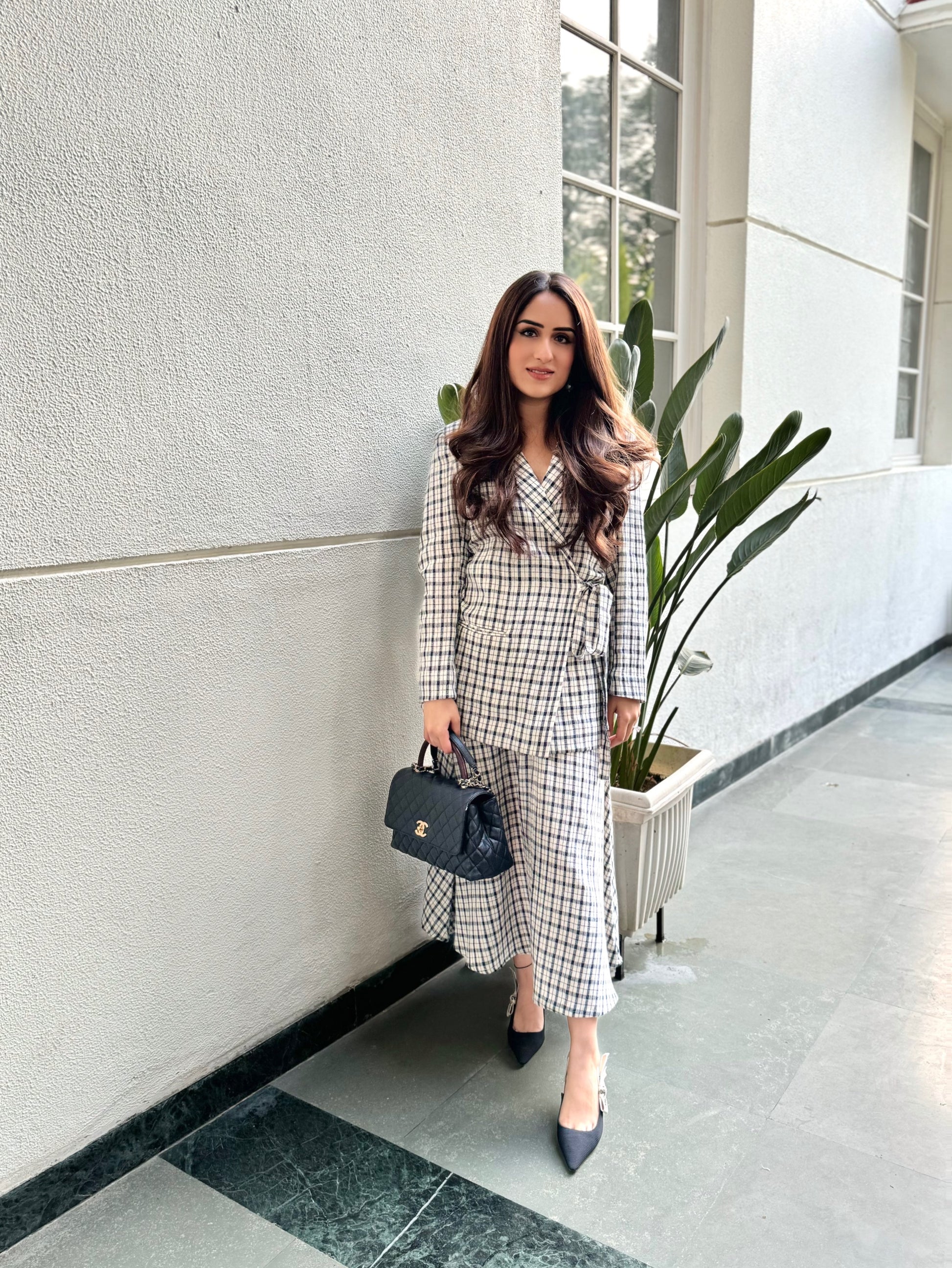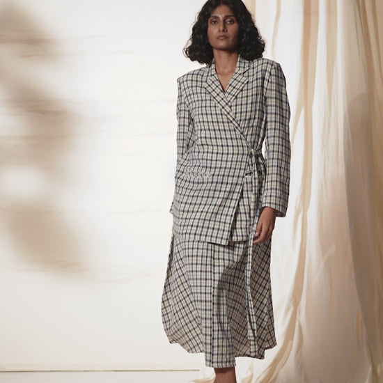 Get ready to slay with our Checkmate Tie Up Blazer, boasting a notch collar and an Angarakha-style drawstring tie-up for a relaxed fit. You can rock the blazer with drawstrings open, pairing it with a dress or basic tee and denims for a chic look. Complete the ensemble with our timeless A-line skirt for an effortless style that stands the test of time.