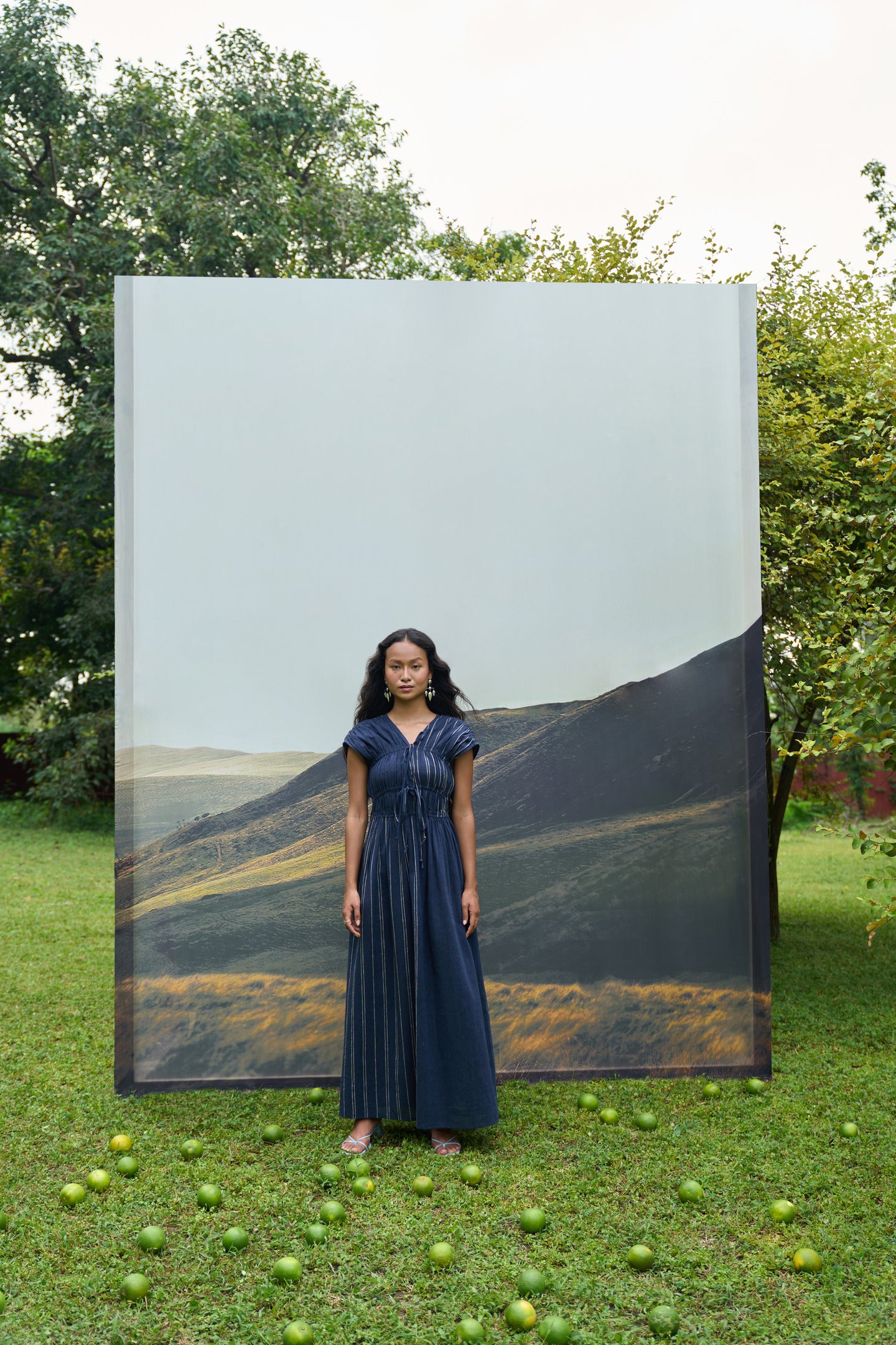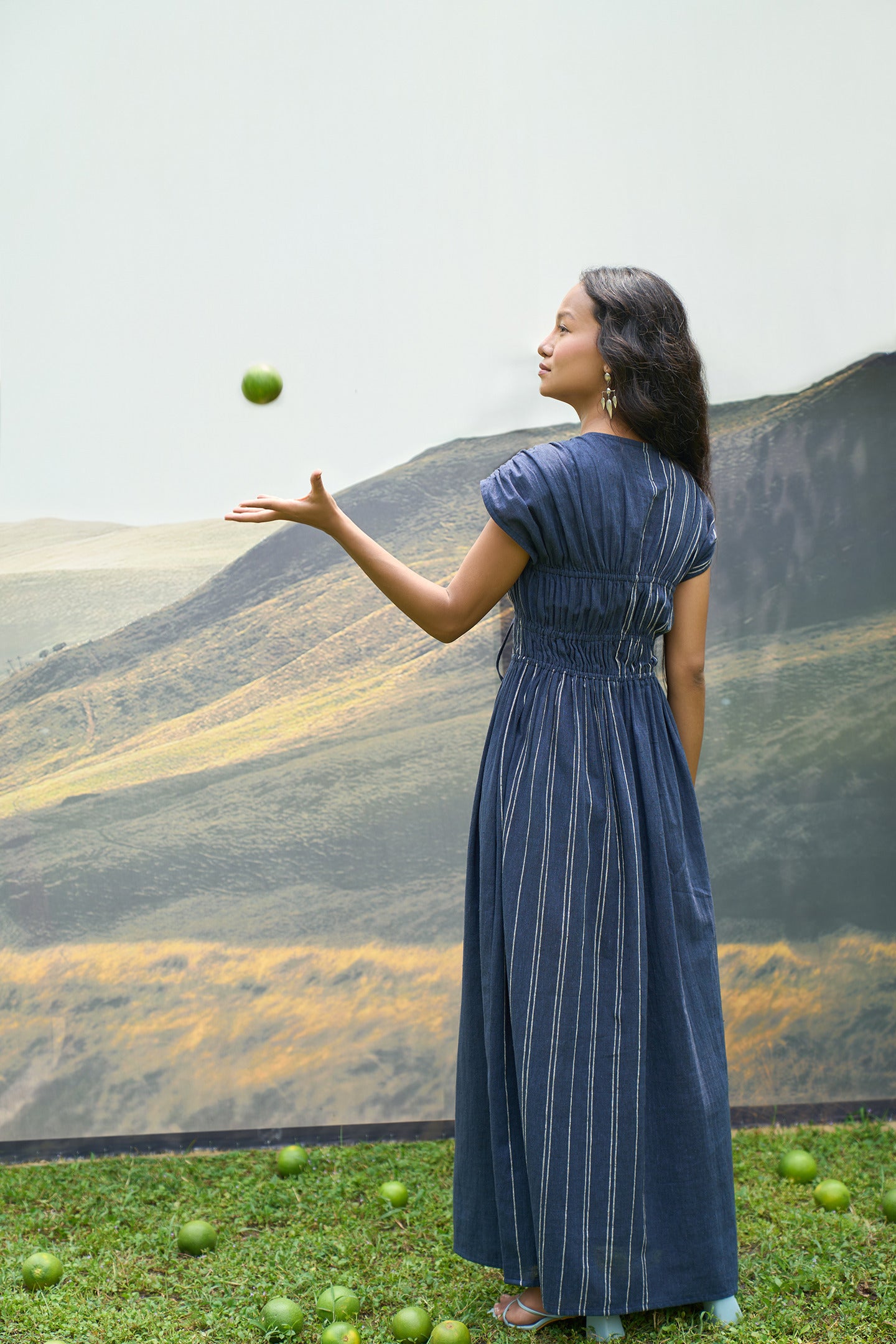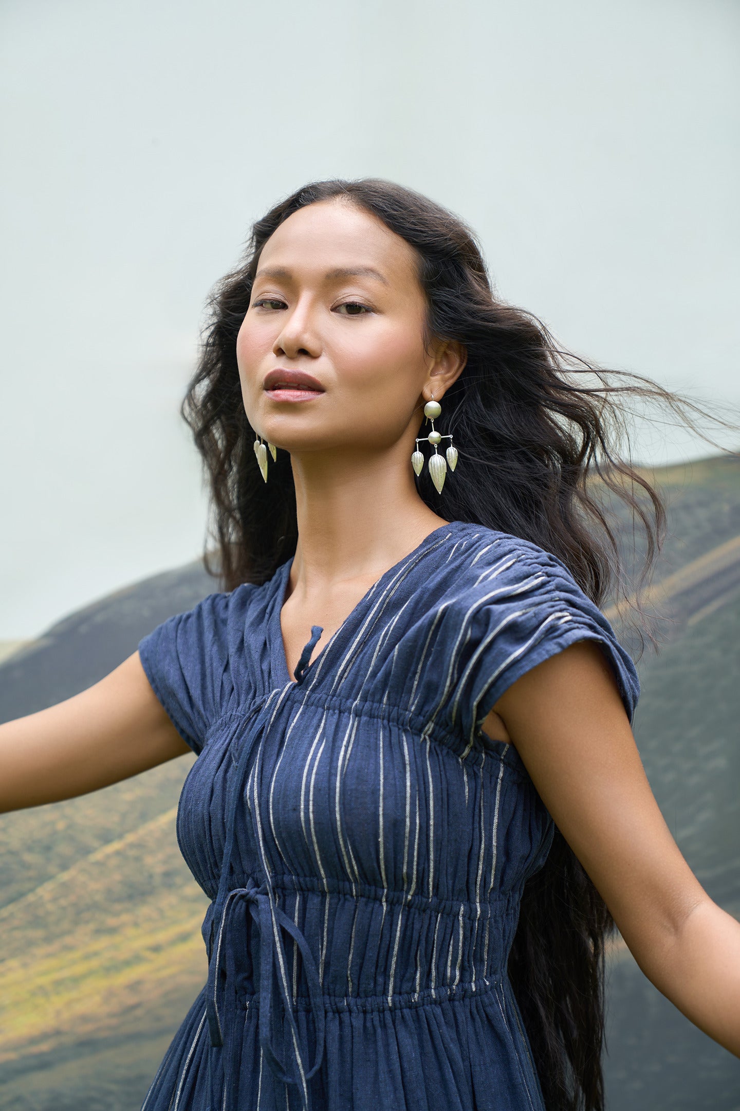 Crafted from handwoven kala cotton, this elegant maxi dress features gathered, elasticated panels up to the waist for a flattering fit. The tie-up openings on the chest add a charming, adjustable detail, making it perfect for effortless, all-day wear. With its relaxed yet stylish design, this dress is a must-have for your wardrobe.