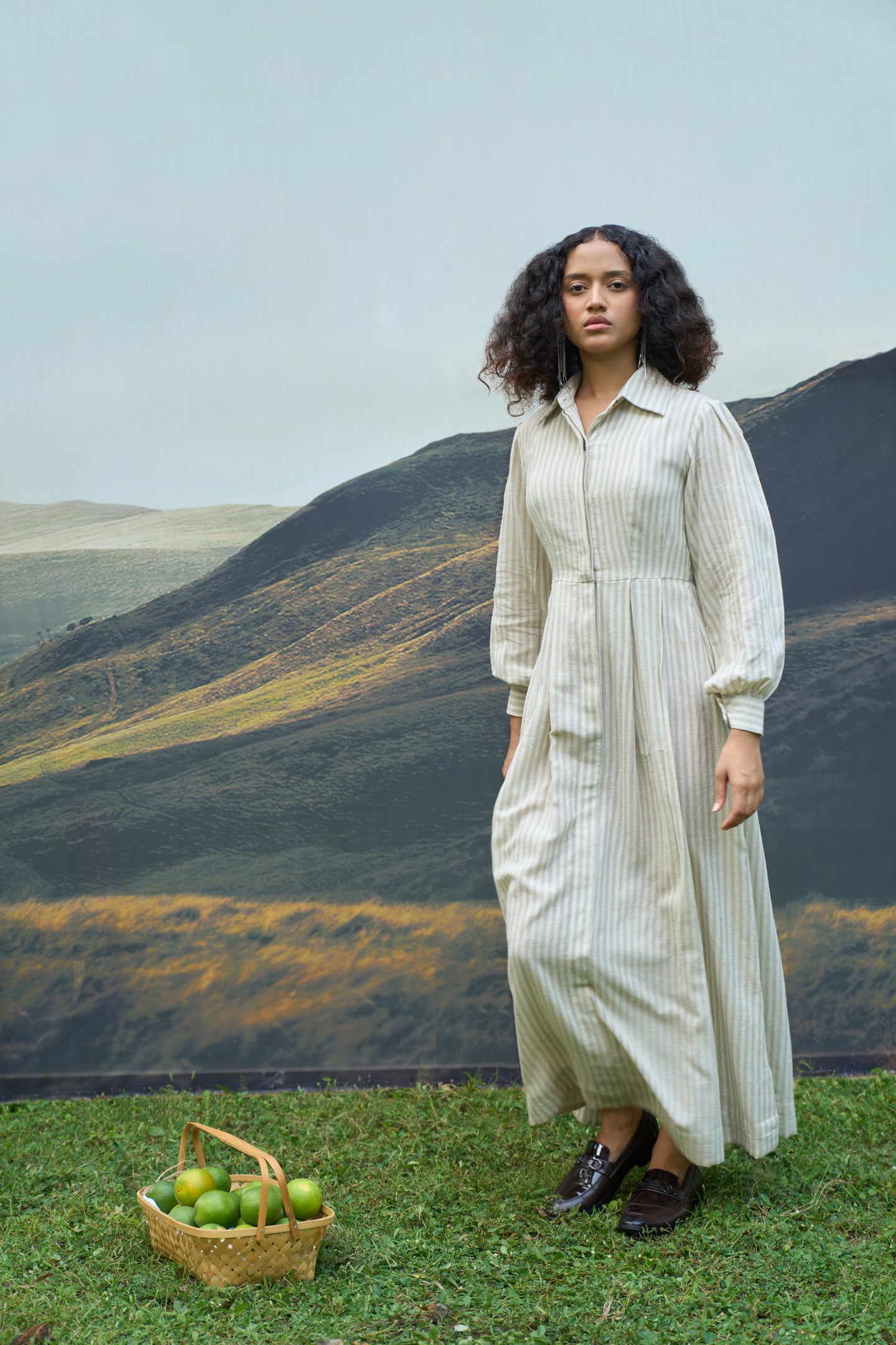 Stay comfortable while exuding effortless style with our Daze Dress. A classic fit-and-flare style, this dress features volume sleeves with cuff details and a flattering princess cut yoke. It has a front opening and is crafted from striped handwoven kala cotton for both breathability and elegance.