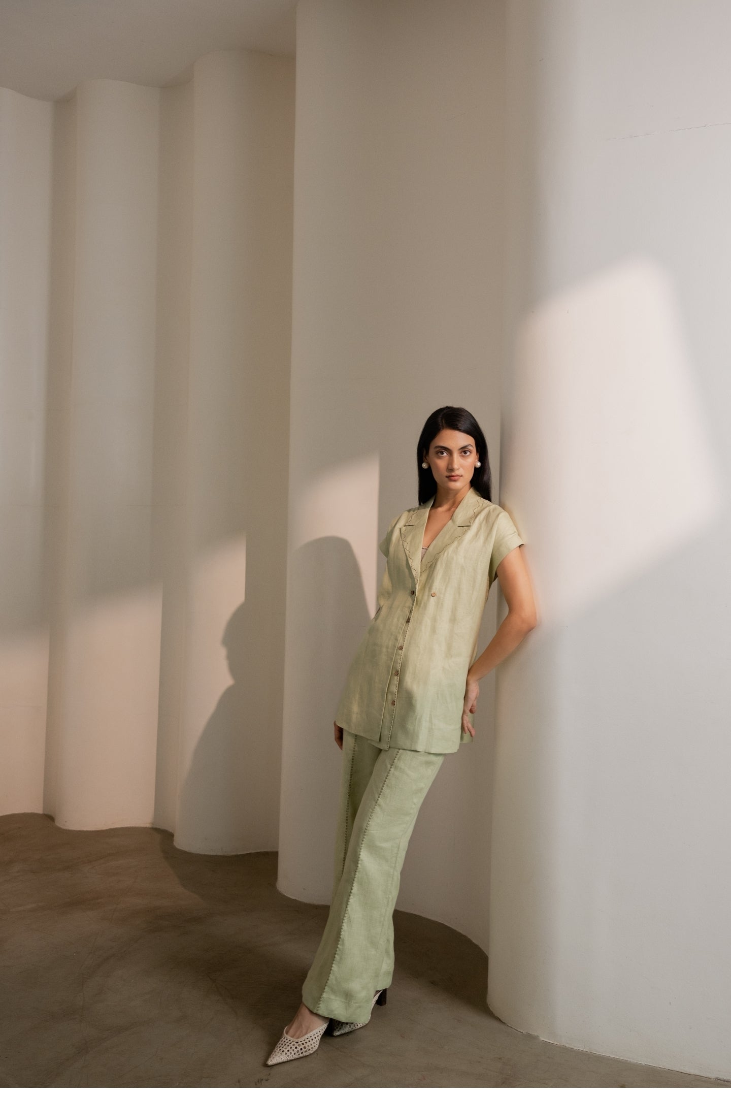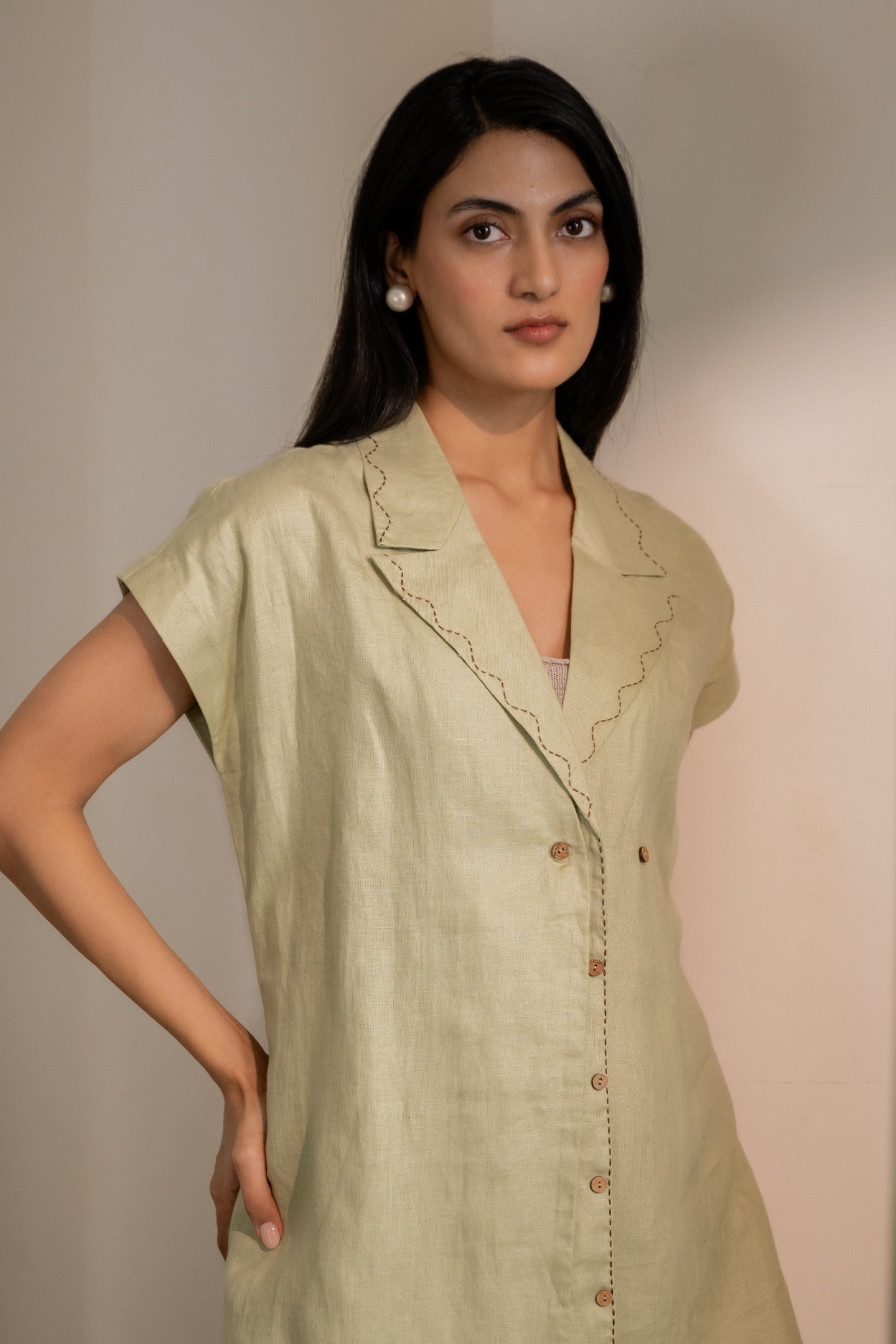 Designed with ease and intention, this comfort-fit piece balances quiet structure with versatility. Adjustable back tie-ups gently cinch the waist and are finished with subtle contrast stitching. A peak lapel with scalloped stitch details adds character, while extended shoulders fall softly over the bicep for an effortless silhouette. Finished with mother-of-pearl buttons and a hand-embroidered buttonhole with two-button closure options allows for a customisable fit.