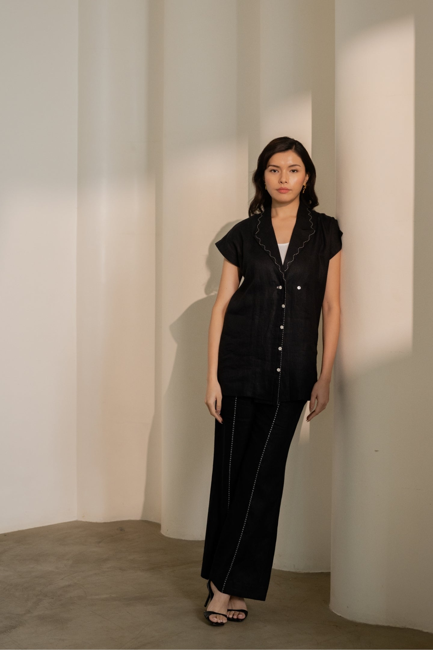 Designed with ease and intention, this comfort-fit piece balances quiet structure with versatility. Adjustable back tie-ups gently cinch the waist and are finished with subtle contrast stitching. A peak lapel with scalloped stitch details adds character, while extended shoulders fall softly over the bicep for an effortless silhouette. Finished with mother-of-pearl buttons and a hand-embroidered buttonhole with two-button closure options allows for a customizable fit.