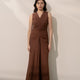 Cut in a fit-and-flare silhouette, this piece features gentle gathers at the front bodice and a bias-cut flare that create an elongated, graceful look. A clean V-neckline and back zip closure complete the design, balancing structure with effortless ease.