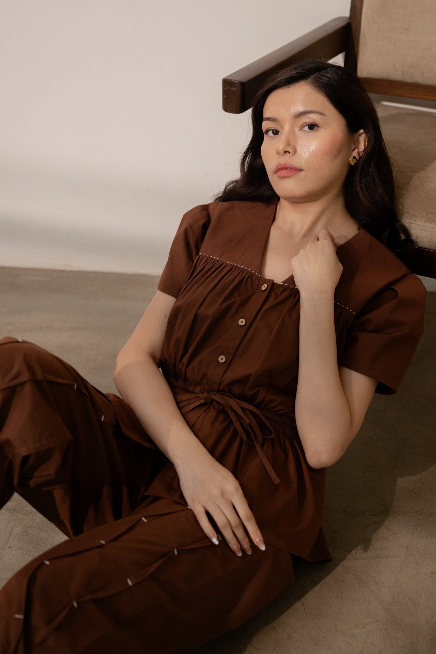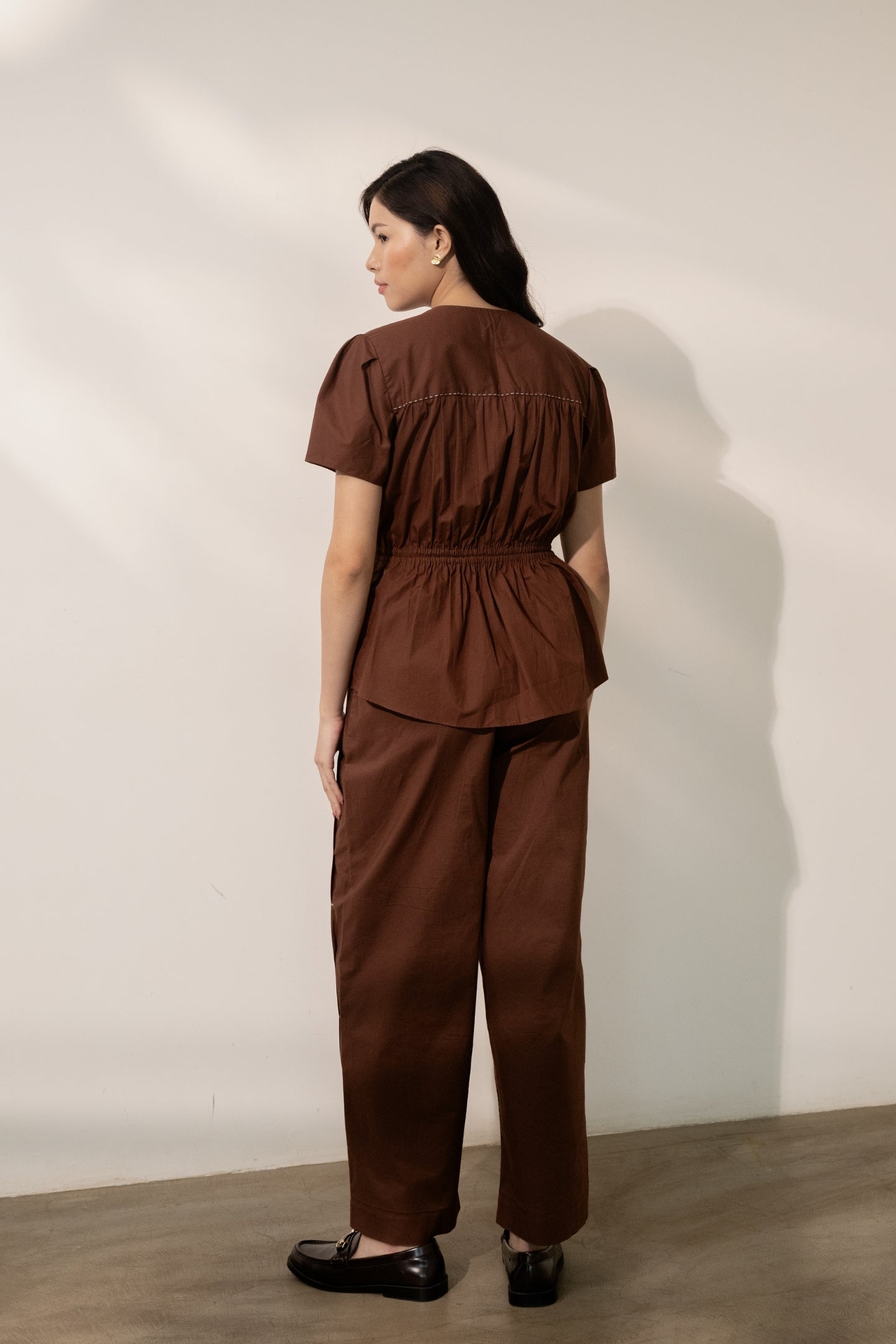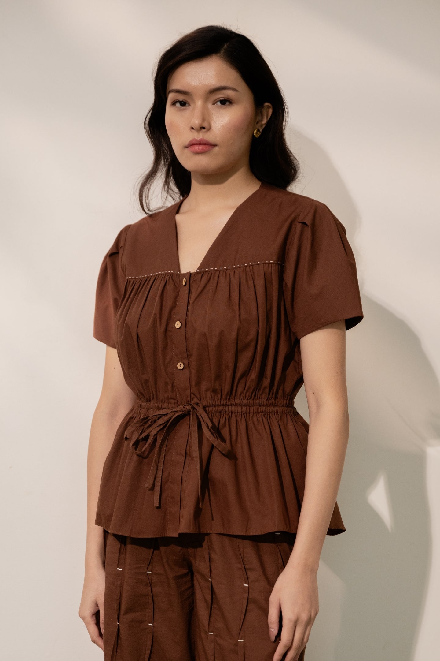 Designed in a comfort fit, this piece features a V-neckline and pleated, voluminous sleeves that add movement and ease. The adjustable gathered waist with a tie-up detail allows for a relaxed, comfortable fit while gently defining the silhouette.