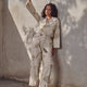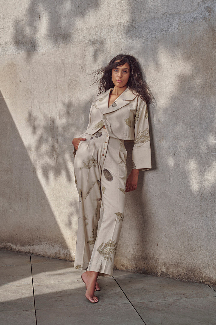 The Khadi trousers are simple yet beautiful with its straight cut, eco printed leaves design and flattering pleat details at the waist.