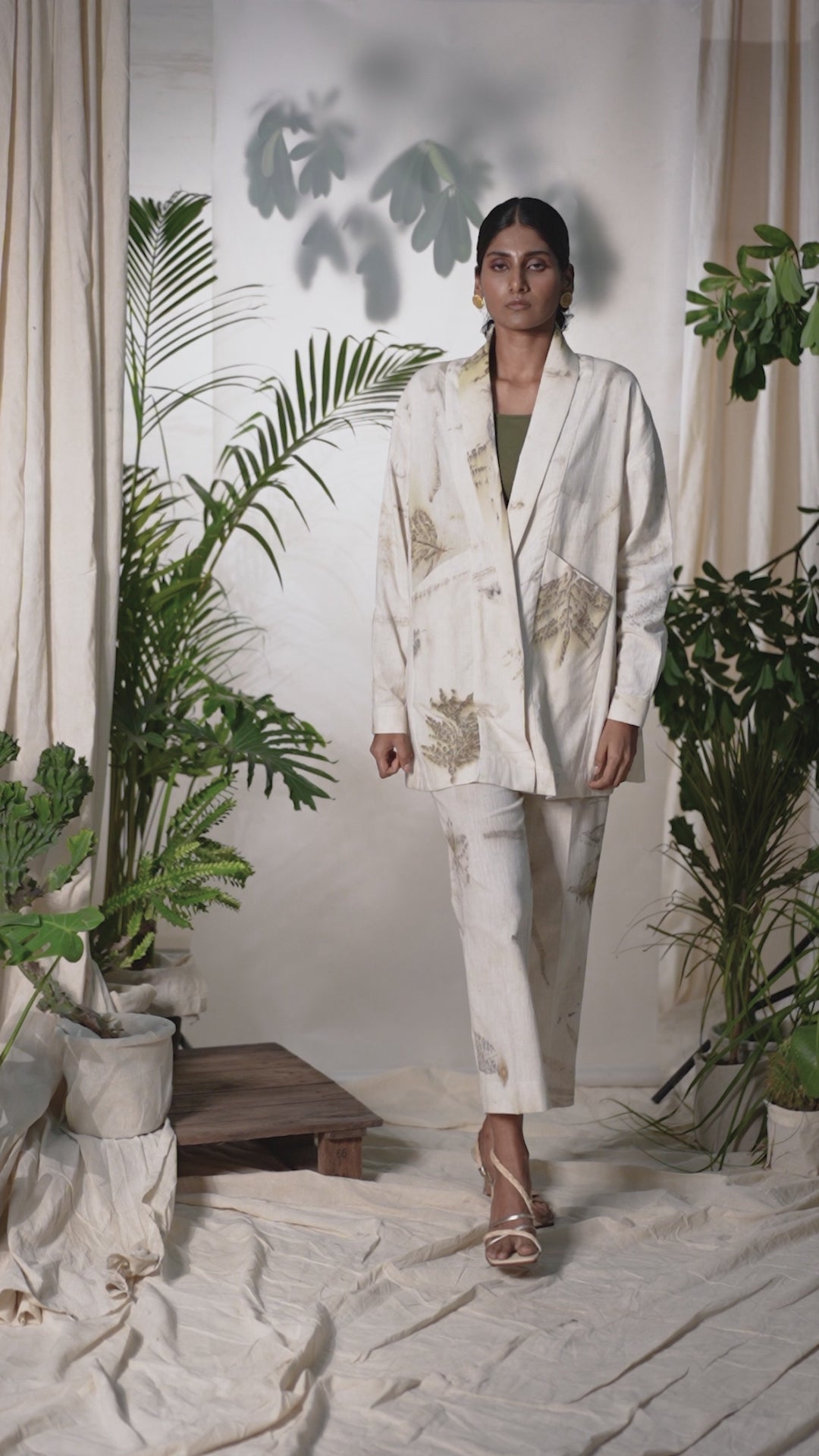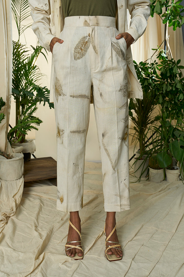 The trousers are simple yet beautiful with its straight cut, eco printed leaves design and flattering pleat details at the waist.