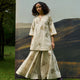 Crafted from handwoven khadi cotton that's ecoprinted with leaves, this set features a classic kurta, designed with sophisticated 3/4 flared sleeves for a graceful silhouette. The sharara-style pants feature a flowing silhouette with intricate paneling that adds depth and movement, making them perfect for both casual and festive occasions.