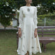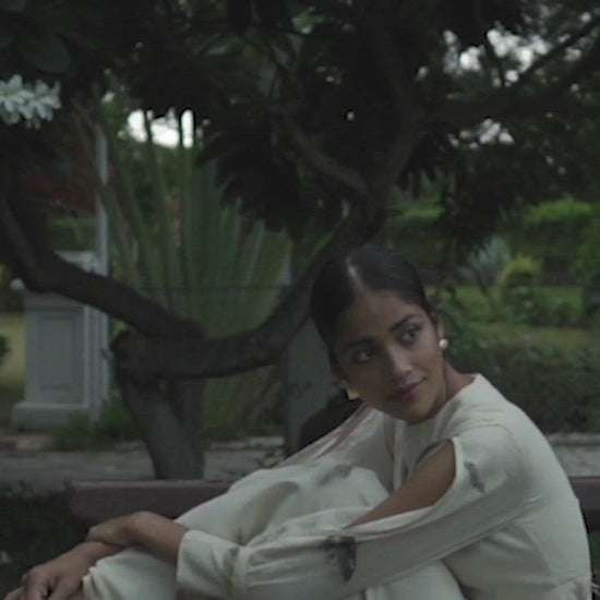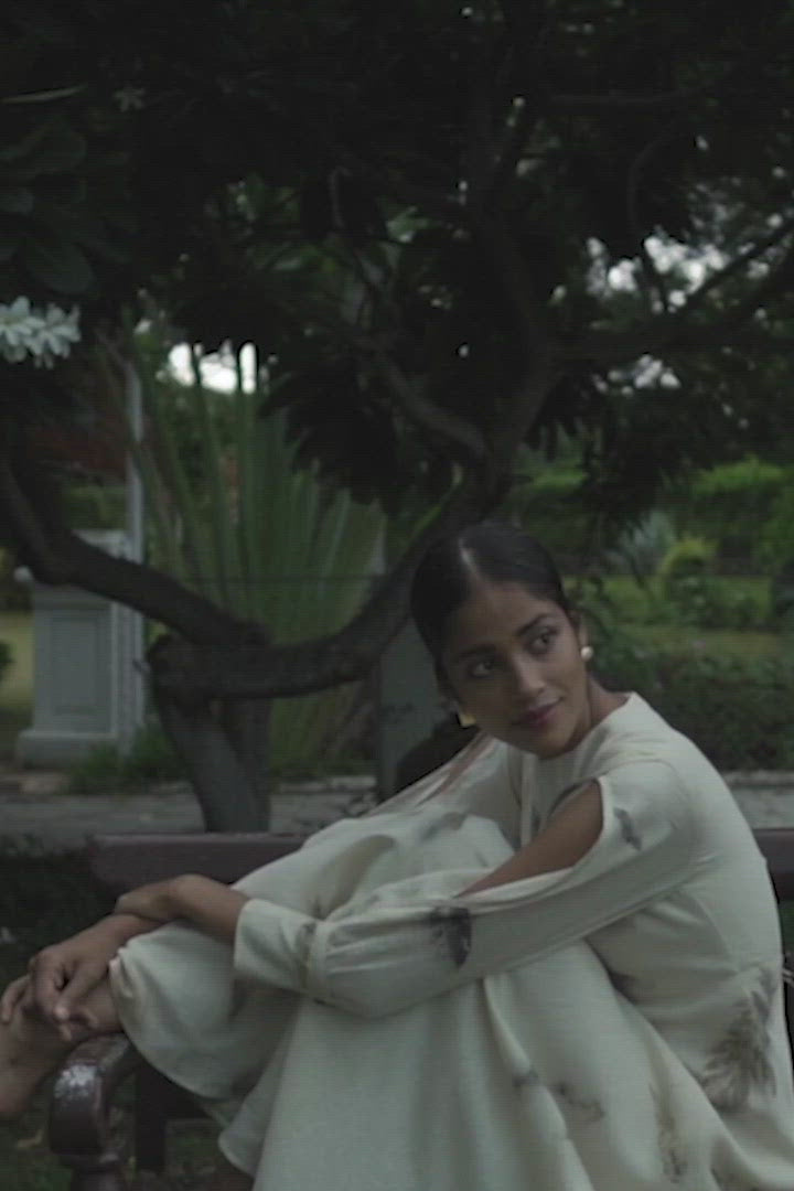 Our Live Leafy Indo-Western dress is eco printed with leaves and made with Khadi Silk. It has a funnel neck with back opening and full sleeves with a stylish keyhole overlap. The skirt comes in midi-length with an umbrella cut to let you move around freely. Wear it with strappy sandals and statements earrings and it's perfect for small gatherings and family functions.