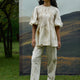 The Live Leafy Pintucks Top & Trousers Set features a class round neck top with intricate pintuck detailing and voluminous adjustable sleeves. The trousers are simple yet beautiful with its straight cut, eco printed leaves design and flattering pleat details at the waist.