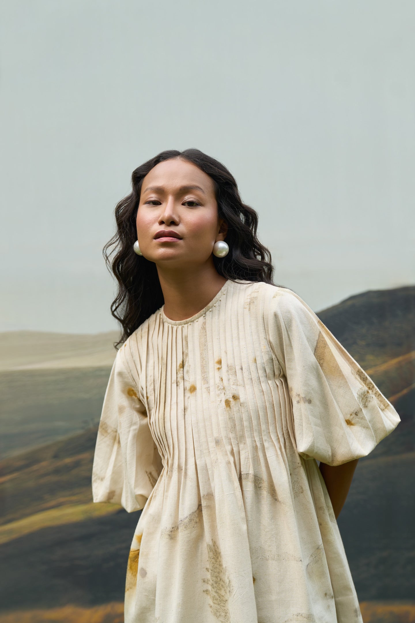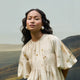 Featuring a classic round neck and intricate pintuck detailing, this top offers a flattering fit with a subtle flare. The volume sleeves are finished with an elastic band, letting you adjust the length to your preference and style.