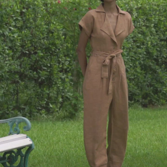Love at first sight. This fall inspired jumpsuit features a jacket style collar and self-fabric belt. It has a front opening and buttoned cuffs on the leg. A great classy and smart add to the wardrobe!