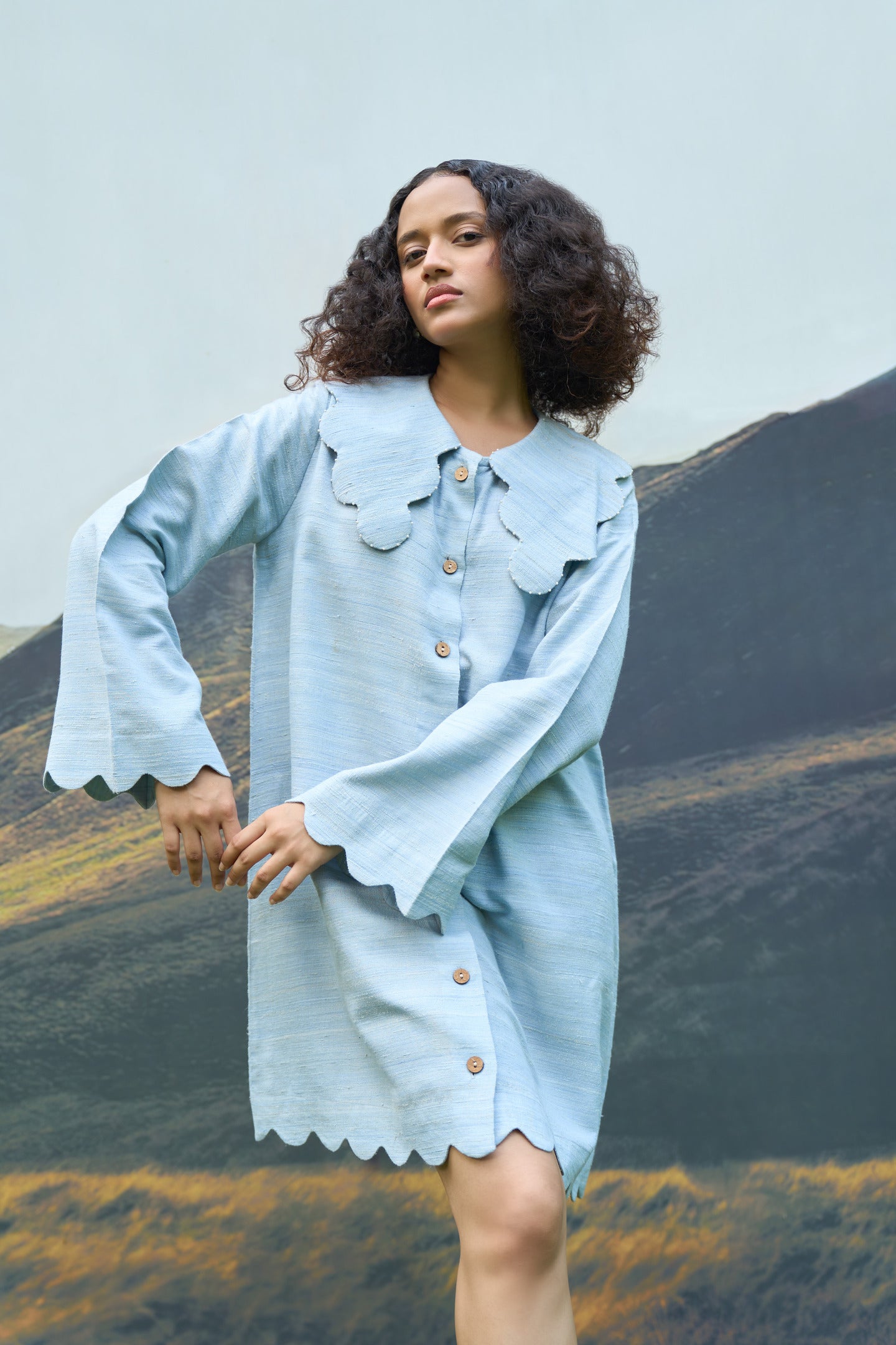 Step into elegance with our Petal Scallop Dress, crafted from luxurious handwoven Eri cotton. This dress features a striking statement collar, beautifully finished with scallop edges that add a touch of whimsy and sophistication to your look.