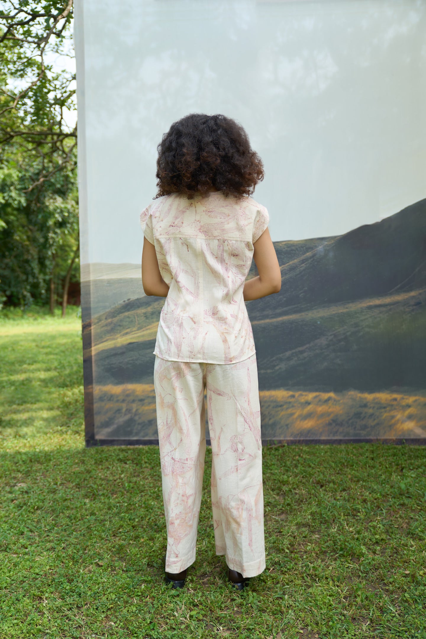 Add a pop of fun to your wardrobe with our Pink Foliage Top & Pants Set. This boxy fit shirt features a cropped front, panelled details, and extended shoulders for a strong, contemporary look. The trousers are flared and designed with elegant pleat details at the waist for a flattering fit.