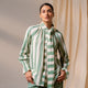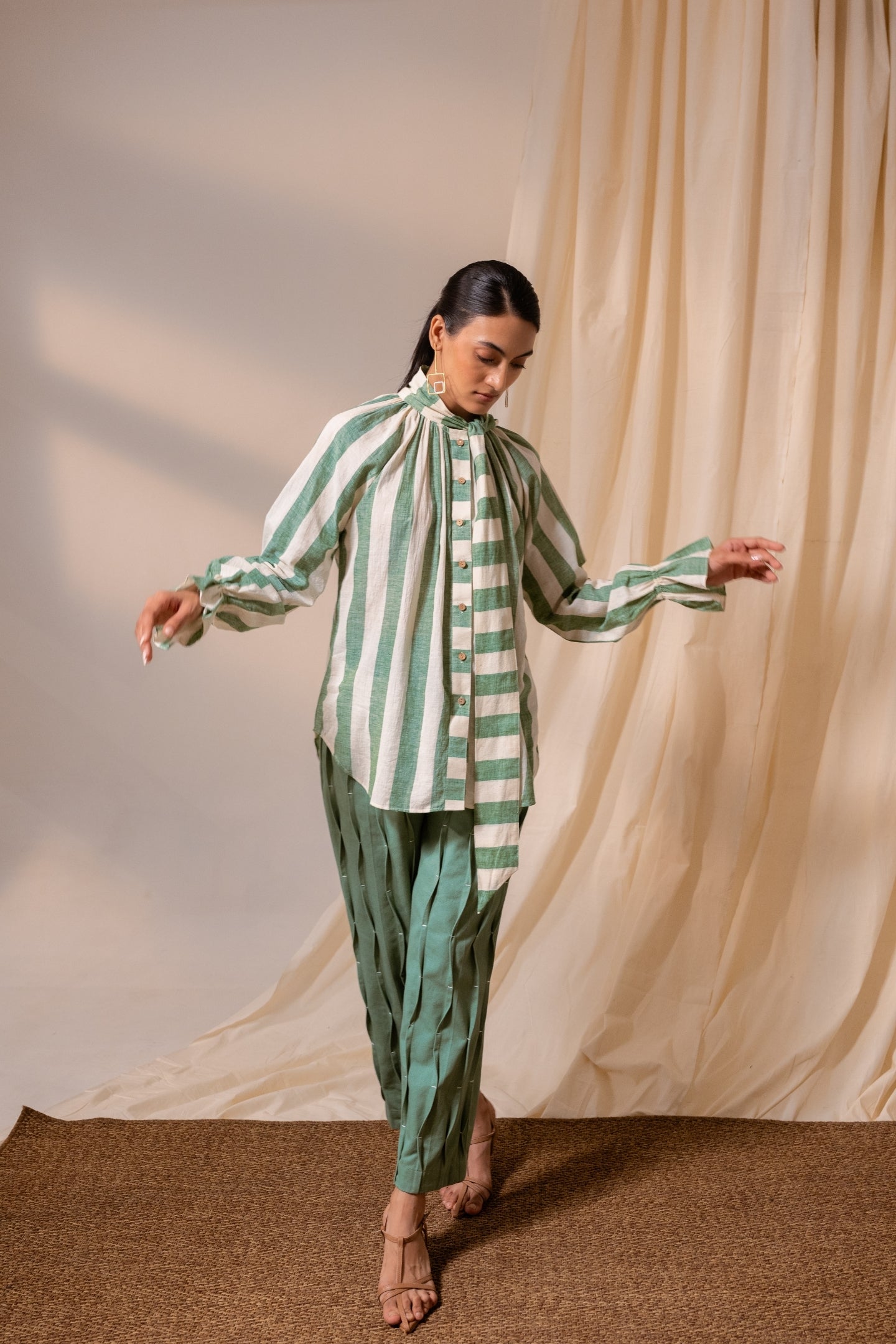 Designed in a relaxed fit, this piece features a front opening with coconut shell buttons and a tie-up detail at the neckline for versatile styling. Voluminous sleeves with elasticated cuffs add subtle drama and ease, balancing comfort with thoughtful, handcrafted detail.