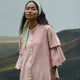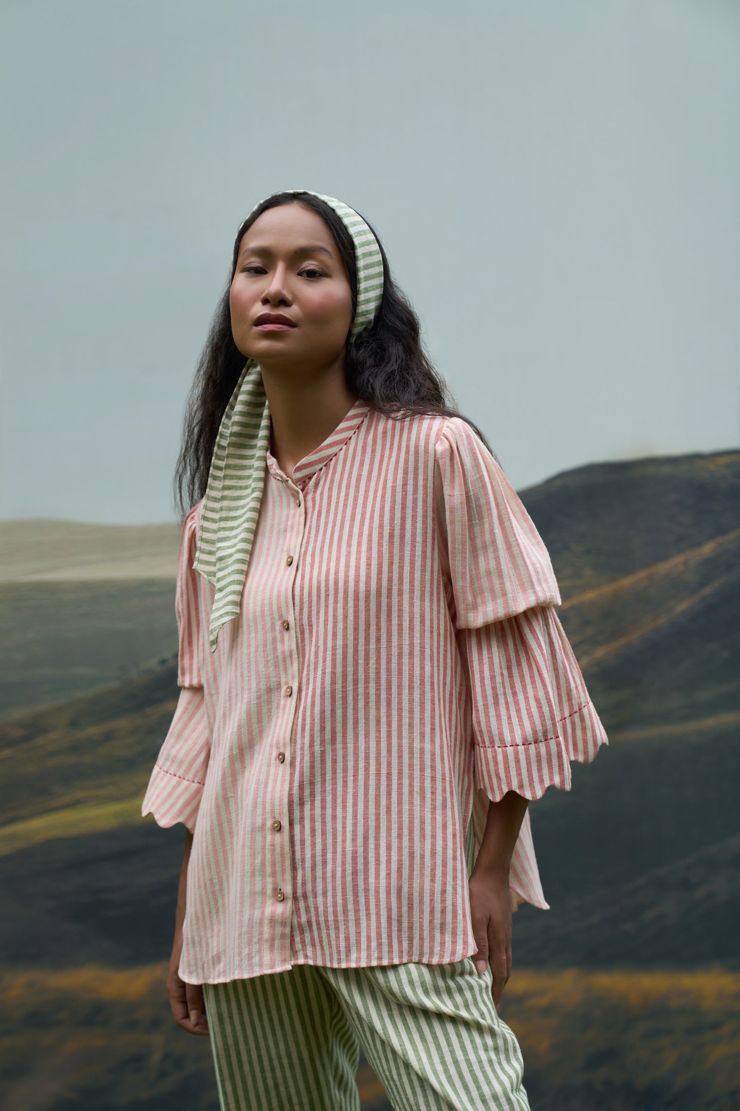 Make a statement with our Scarlet Top, a stylish striped shirt that features elegant scallop edge details on the sleeves and a sophisticated Chinese collar. The sleeve is elasticated allowing for a voluminous look while providing the flexibility to adjust the sleeve length, making it both chic and functional.