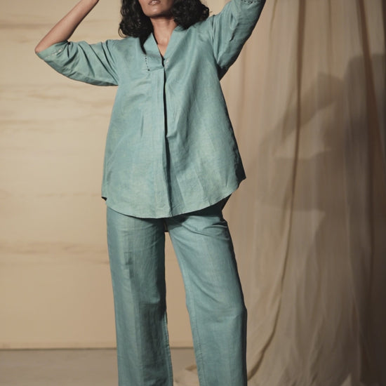 This kurta top features a flattering V neckline and a box pleat detail, creating a graceful silhouette. It has mid-length sleeves and delicate hand embroidery details at the neckline and the sleeve hem for some added charm.
